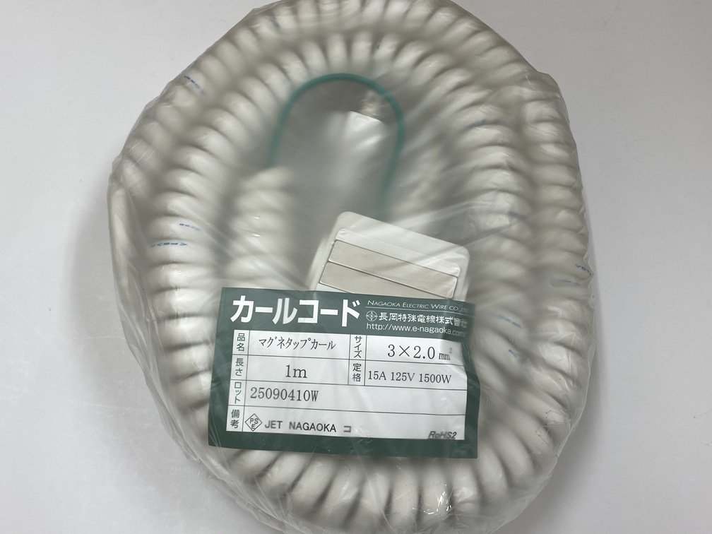 長岡特殊電線 マグネタップカール 弊社サイトにて1本から販売しております。カールコードの両端末にプラグを「一体成型」、カールコード オス メス プラグ付。定格:15A 125V 1500W以下。マルチタップは差込口が3ヶ所あります。天井とコンセントと接続することで、床面に電源コードを這わせる必要がなくなり安全性とインテリア性の向上に貢献します。芯数は2芯と3芯、カール部長さは1mと2m、色は白と黒がございます。ご購入は下記商品ページより、宜しくお願い致します。