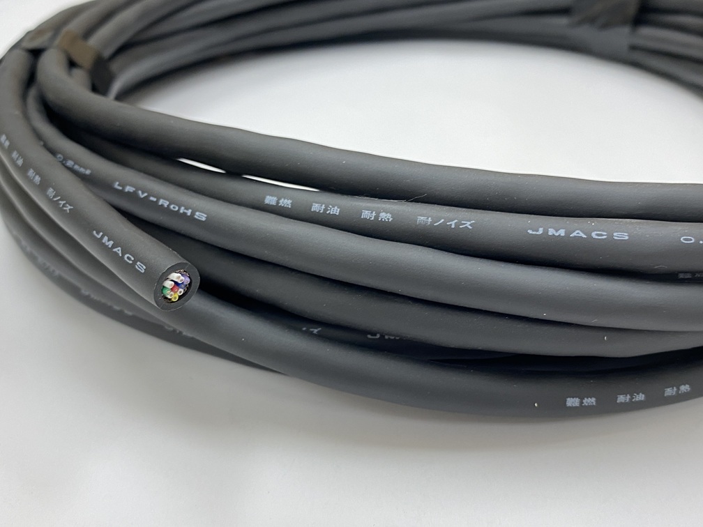 JMACS (旧 日本電線工業) KNPEV-SB(計装用ポリエチレン絶縁ビニルシースケーブル)は、耐燃、耐油、耐熱、耐ノイズ性に優れたケーブルです。計装用ケーブルは、工場内における各種生産設備の自動制御や集中監視システム等の配線、またはオフィスにおけるコンピュータシステムの回線などに使用される小勢力回路用(使用電圧6 0 V 以下)のケーブルです。弊社ショップにて、切断品1m~販売しております。画像の製品は、KNPEV-SB 0.2SQ×5P です。KNPEV-SBケーブルを使用したハーネス加工も承ります。宜しくお願い致します。