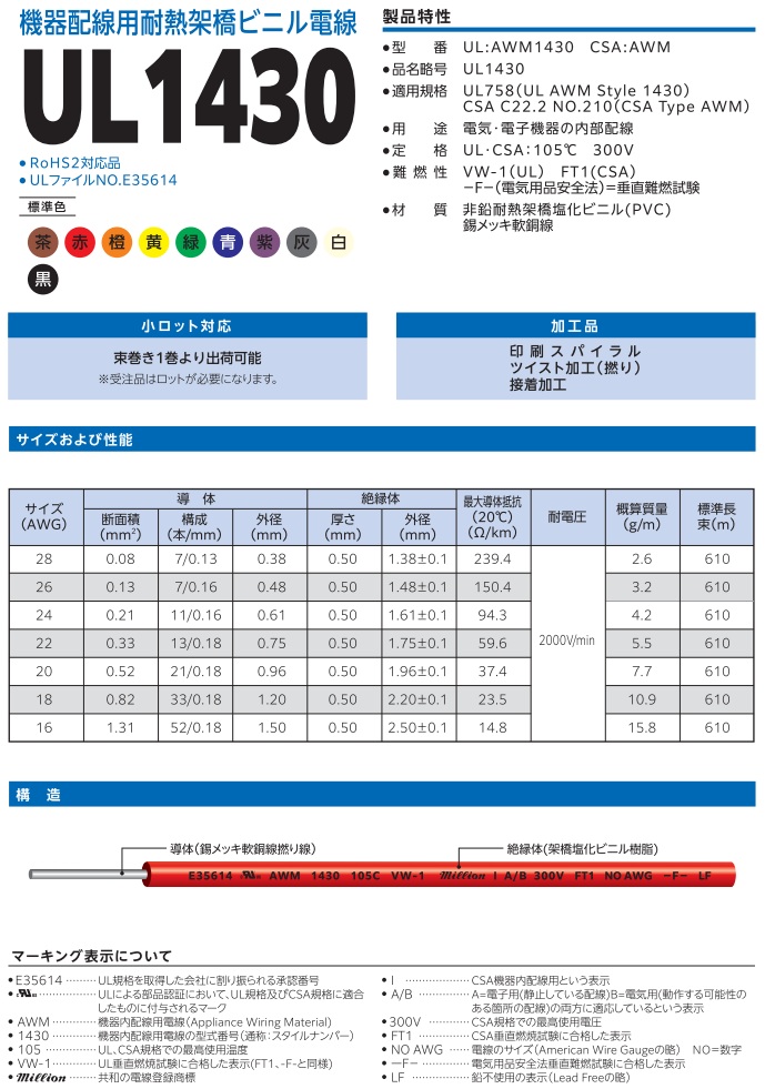 特徴:耐熱架橋 PVC 絶縁体により、はんだ付け時の溶融を低減
